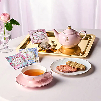 | 内容量 | ロイヤル シークレット ガーデン(ニナス オリジナル マリー・アントワネット ティー・ロイヤル ダージリン×各1袋、ジャスミン インペリアル×2袋)、ワッフルチョコレートサンドクッキー(プレーン×2枚、ストロベリー×3枚) |