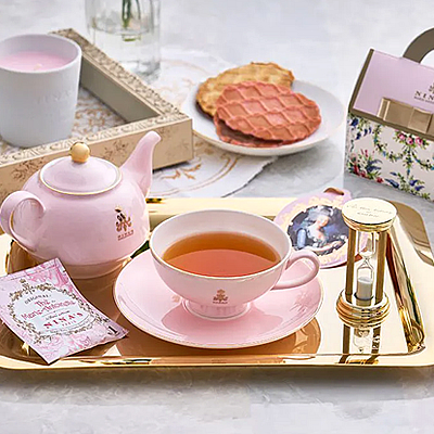 | 内容量 | ロイヤル シークレット ガーデン(ニナス オリジナル マリー・アントワネット ティー・ロイヤル ダージリン・ジャスミン インペリアル×各1袋)、ワッフルチョコレートサンドクッキー(プレーン×1枚、ストロベリー×2枚) |