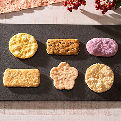 国産米100%を使用した海老カレー煎餅・黒ごま入り玄米煎餅・海老胡椒煎餅・えびまめ花煎餅・つぶやきサラダ煎餅、金澤カレー煎餅の6種類を詰合せました。